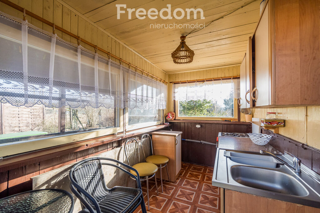 drewniany domek letniskowy z mediami oraz niewielka szklarnia.